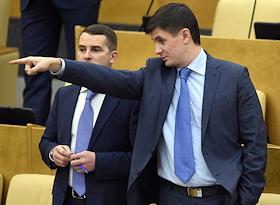 Заместитель председателя комитета Государственной думы (ГД) России по природным ресурсам, природопользованию и экологии Максим Шингаркин (слева) и член комитета ГД России по физической культуре, спорту и делам молодежи Николай Валуев (справа) во время пленарного думского заседания.