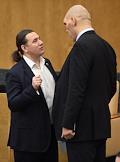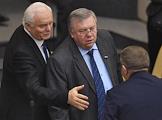 Член комитета Госдуарственной думы (ГД) России по конституционному законодательству и государственному строительству Владимир Поневежский (слева) и член комитета ГД России по физической культуре, спорту и делам молодежи Владислав Третьяк (справа) на пленарном думском заседании.