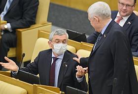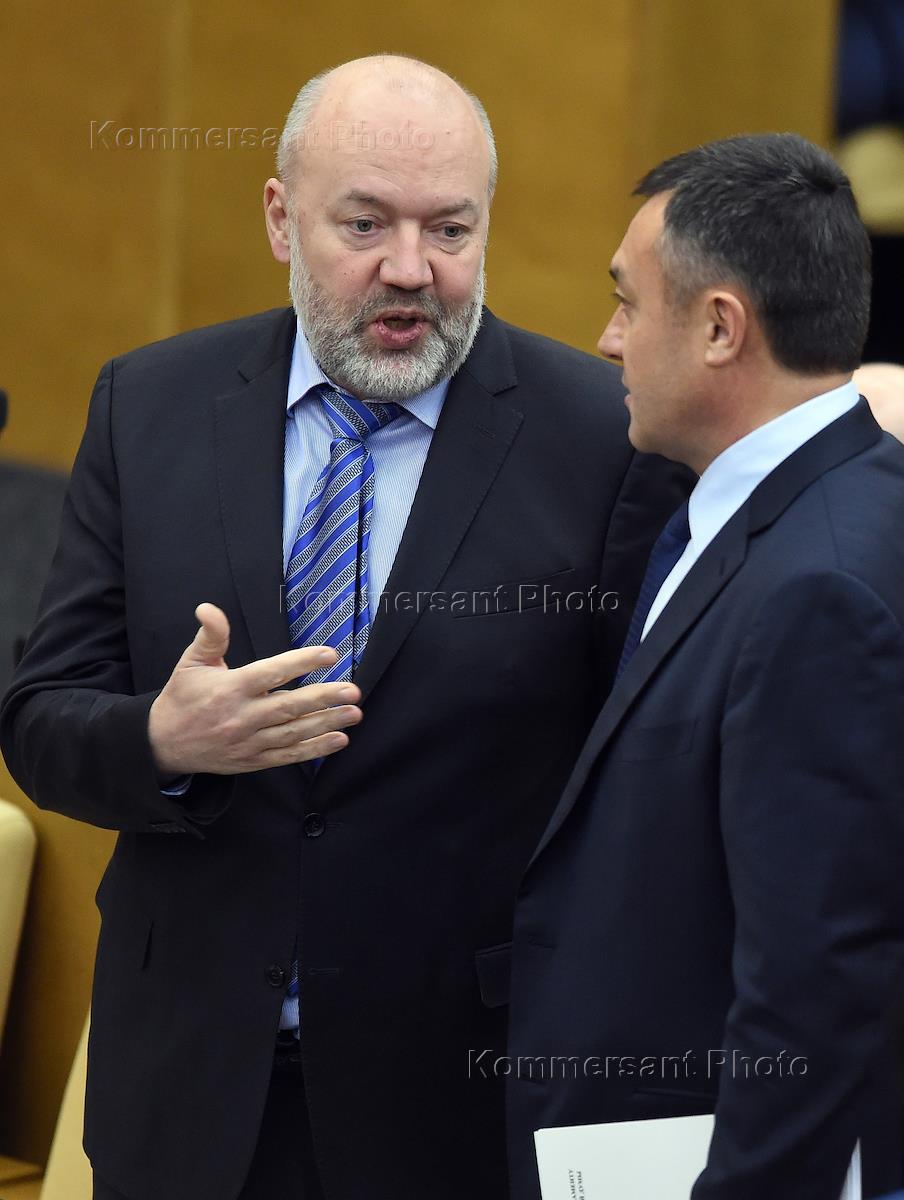 Член комитета Государственной думы (ГД) России по охране здоровья Александр Петров (слева) и член комитета ГД России по конституционному законодательству и государственному строительству Владимир Поневежский (справа) во время пленарного думсктго заседания.
