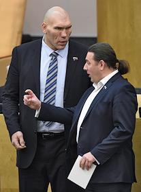 Член комитета Государственной думы (ГД) России по физической культуре, спорту и делам молодежи Николай Валуев (справа) и заместитель председателя комитета ГД России по природным ресурсам, природопользованию и экологии Максим Шингаркин (справа) во время пленарного думского заседания.