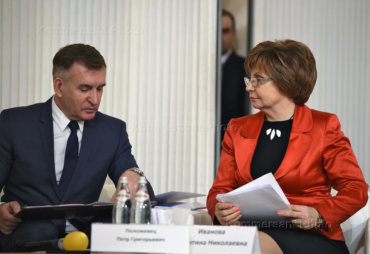 Пленарное заседание IX съезда педагогов России "Воспитание гражданина и патриота" прошло в Колонном зале Доме Союзов. Главный редактор "Учительской газеты" Петр Положевец (слева) и ректор Московского государственного университета технологий и управления имени К.Г.Разумовского Валентинна Иванова (справа) во время съезда.