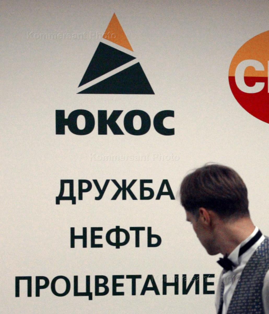 Церемония подписания договора между НК "ЮКОС" и Китайской национальной нефтяной компанией. Плакат с эмблемой "ЮКОС" "Дружба Нефть Процветание" в штаб-квартире компании "ЮКОС".