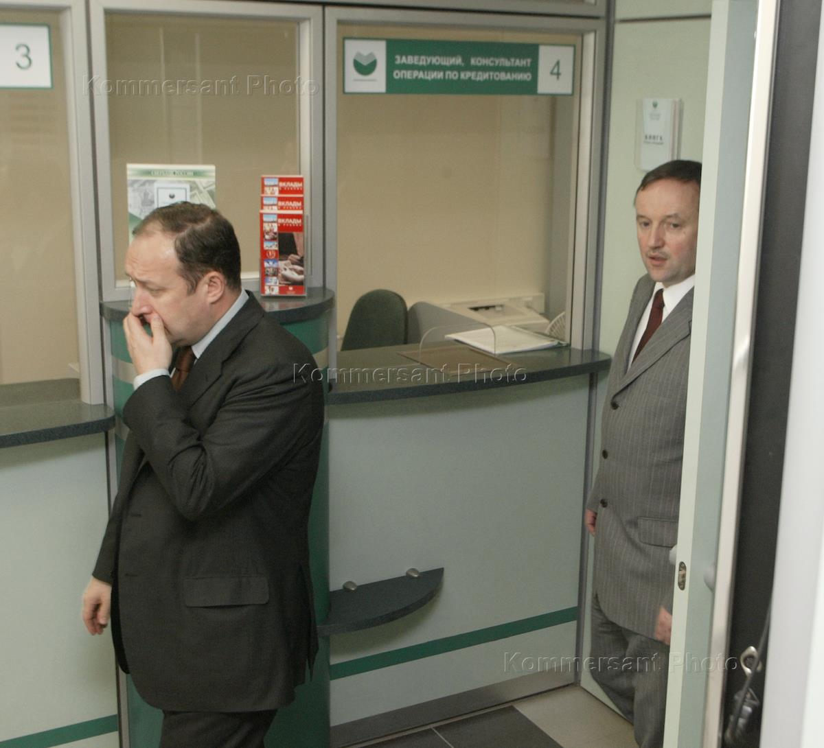 Russian Transportation Minister Sergey Frank (right) and Sberbank chairman Andrey Kazmin (left) arrive at the news conference summoned to announce opening of new Sberbank outlet in the Railway Ministry headquarters. The news conference was held in the maritime transportation department of the Transportation Ministry.