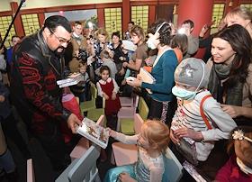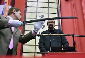 Американский актер Стивен Сигал (справа) на церемонии открытия выставки "Миссия "Самурай-воспитание духа" в интерактивном театре будущего De Arte.