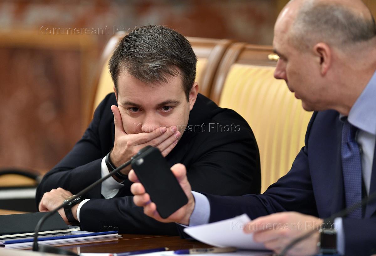 Министр связи и массовых коммуникаций России Николай Никифоров (слева) и министр финансов России Антон Силуанов (справа) перед началом заседания правительства России.