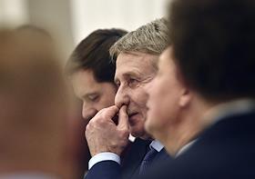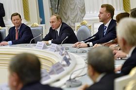 Первый заместитель председателя правительства России Игорь Шувалов (справа) во время встречи президента России Владимира Путина (слева) с представителями деловых кругов страны. Встреча прошла в Кремле.