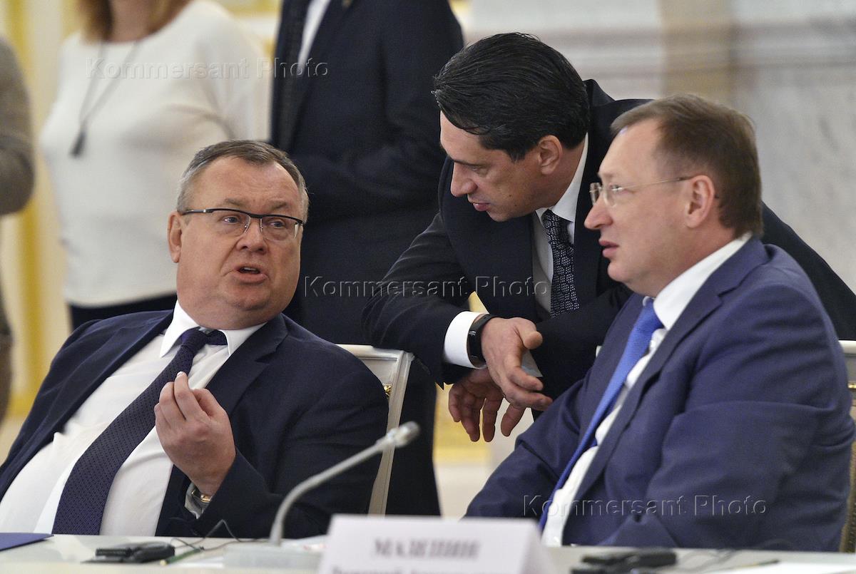 Встреча президента России Владимира Путина с представителями деловых кругов страны в Кремле. Слева направо: председатель совета директоров "Группы "Илим" Захар Смушкин, владелец Volga Group Геннадий Тимченко, главный исполнительный директор, председатель правления ПАО "НК "Роснефть" Игорь Сечин перед началом встречи.