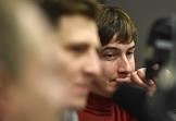 Запись новогоднего эфира на радиостанции "Коммерсантъ-FM". Первый заместитель заведующего отделом внешней политики газеты "Коммерсантъ" Максим Юсин (слева) и генеральный продюсер радиостанции "Коммерсантъ FM" Анатолий Кузичев (справа) во время эфира.