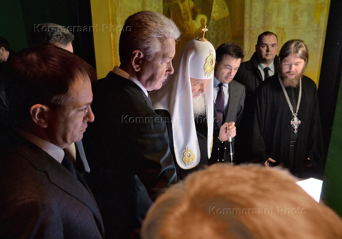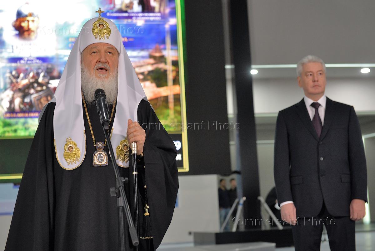 Патриарх Московский и Всея Руси Кирилл (слева) и мэр Москвы Сергей Собянин (справа) на церемонии открытия исторического парка "Россия - моя история" в 57 павильоне на ВДНХ.