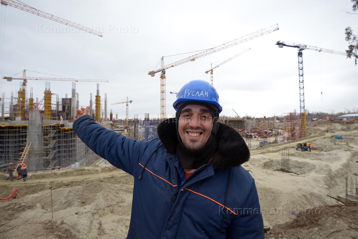 Views of Volgograd. Worker is at the building site of football stadium 'Volgograd Arena'.