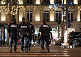Виды Парижа. Рождественская иллюминация. Сотрудники полиции на одной из улиц города.