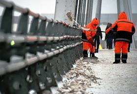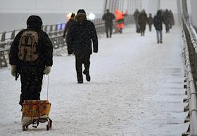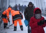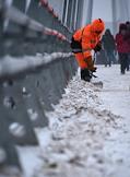 Жанровая фотография. Снегопад в Москве. Уборка снега на пешеходном мосту Павшинской поймы.