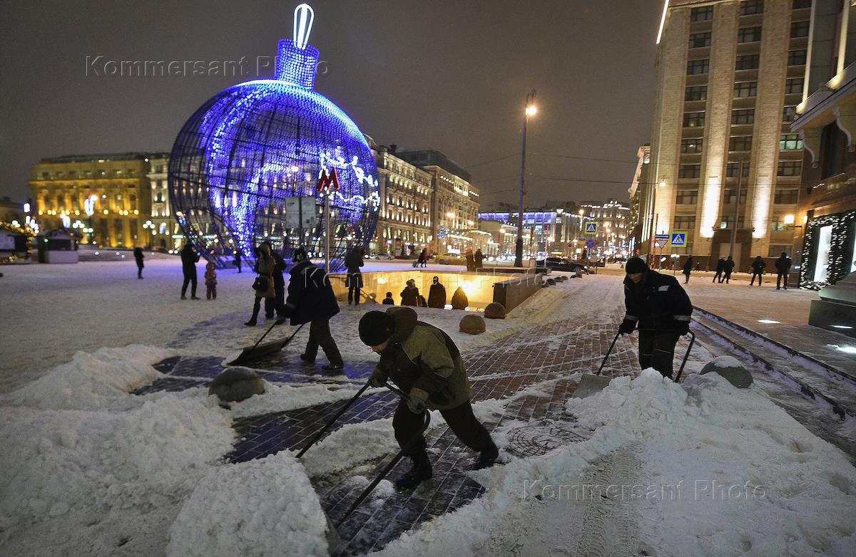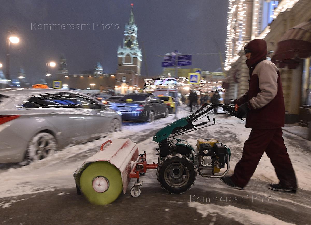 Виды Москвы. Снегопад в городе. Уборка снега у здания ГУМа.