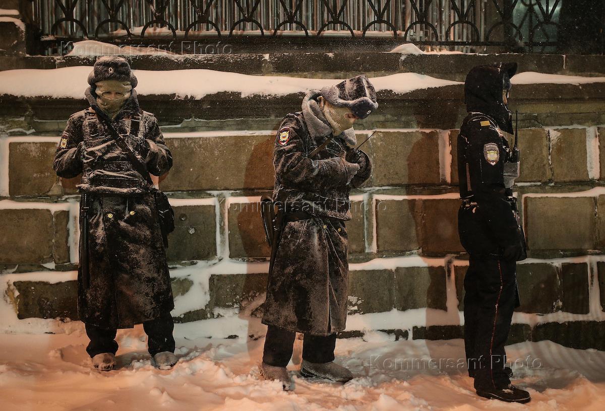 Виды Москвы. Снегопад в городе. Сотрудники полиции во время дежурства на Красной площади.
