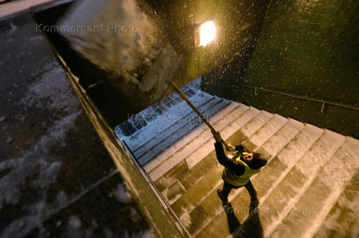 Жанровая фотография. Снегопад в Москве. Дворник убирает снег с лестницы подземного перехода в центре города.