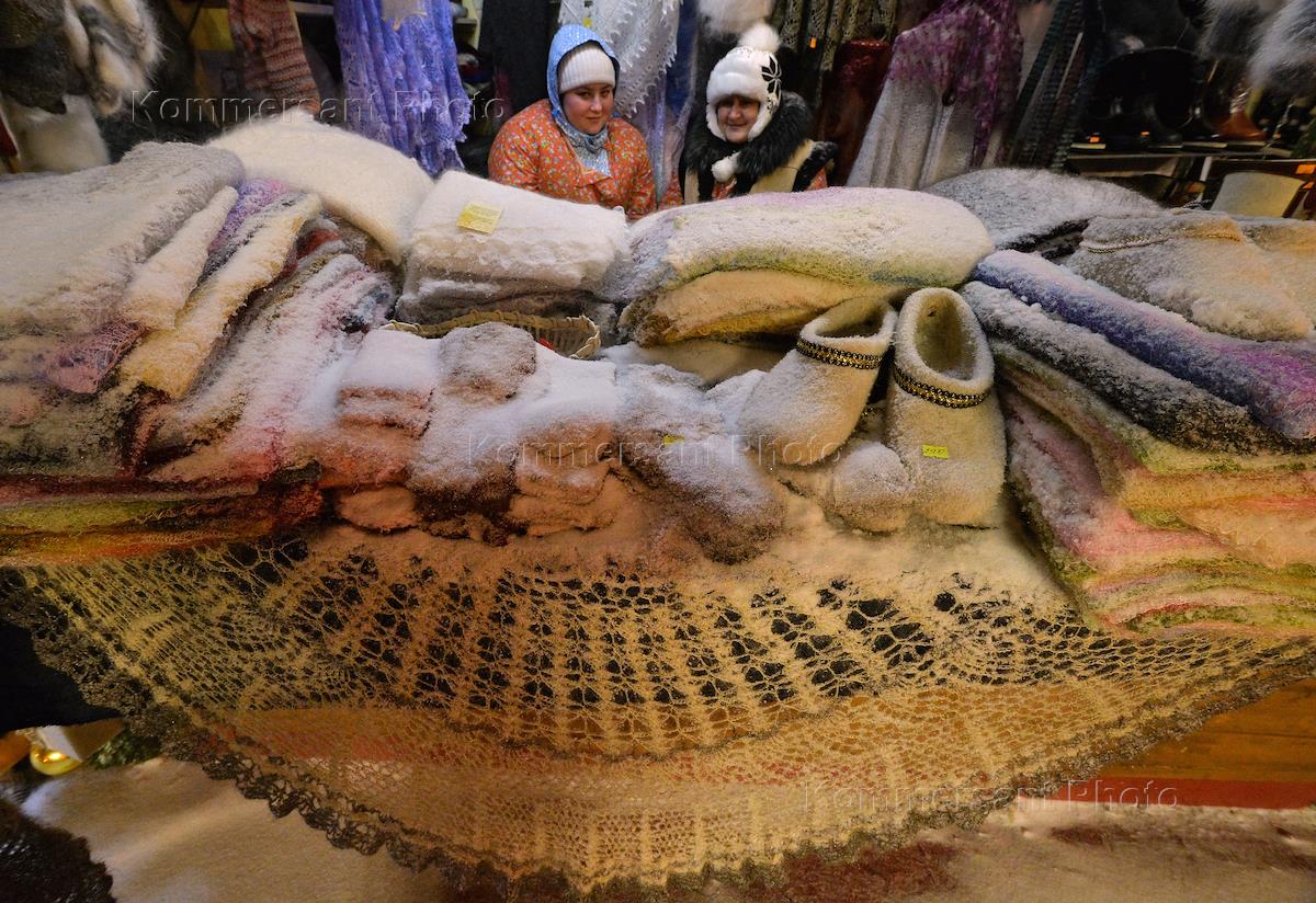 Жанровая фотография. Снегопад в Москве. Рождественнская ярмарка на Манежной площади. Павильон по продаже валенной обуви, платков и варежек.