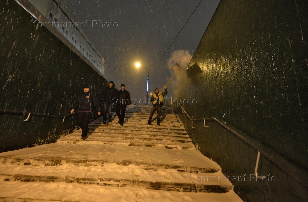 Жанровая фотография. Снегопад в Москве. Дворник убирает снег с лестницы подземного перехода в центре города.