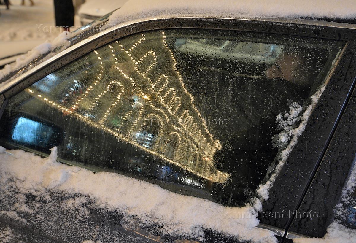 Жанровая фотография. Снегопад в Москве. Отражение в стекле заснеженного автомобиля.