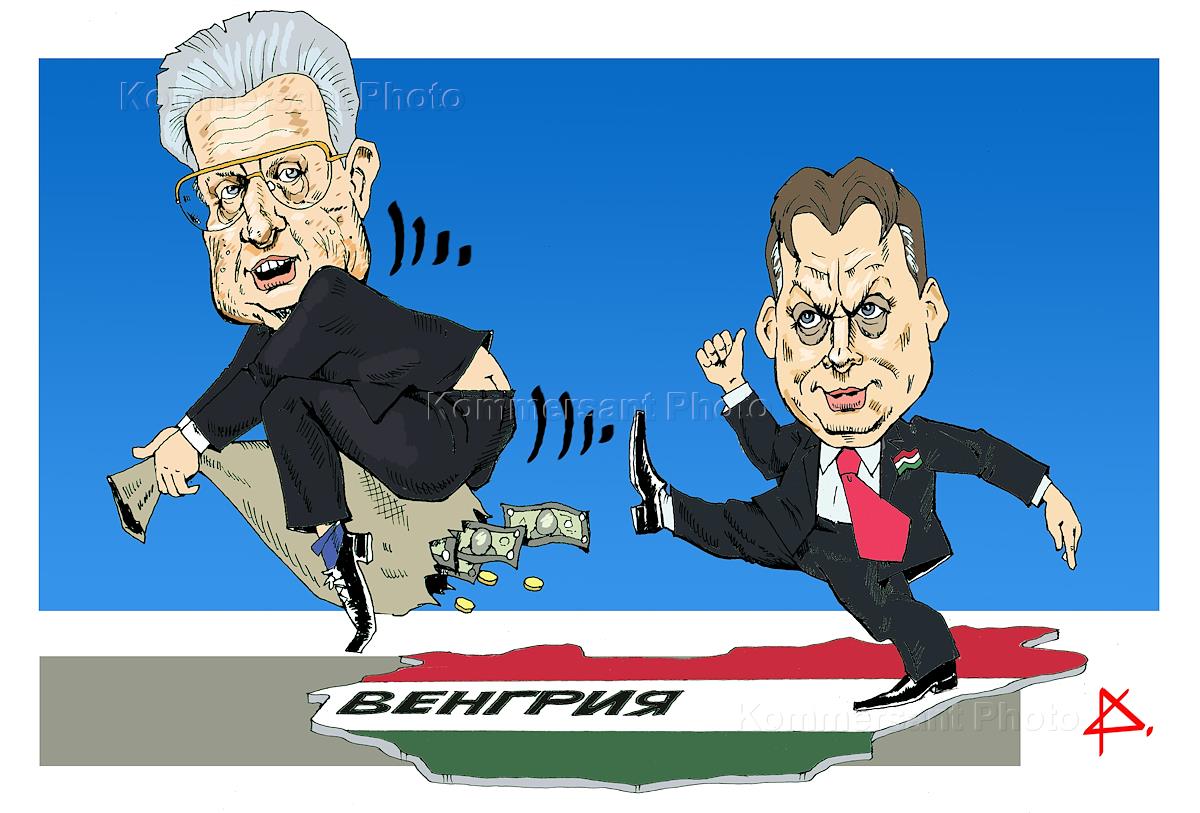 Caricatures and Cartoons. Hungarian Prime minister Victor Orban kick American investor George Soros out.