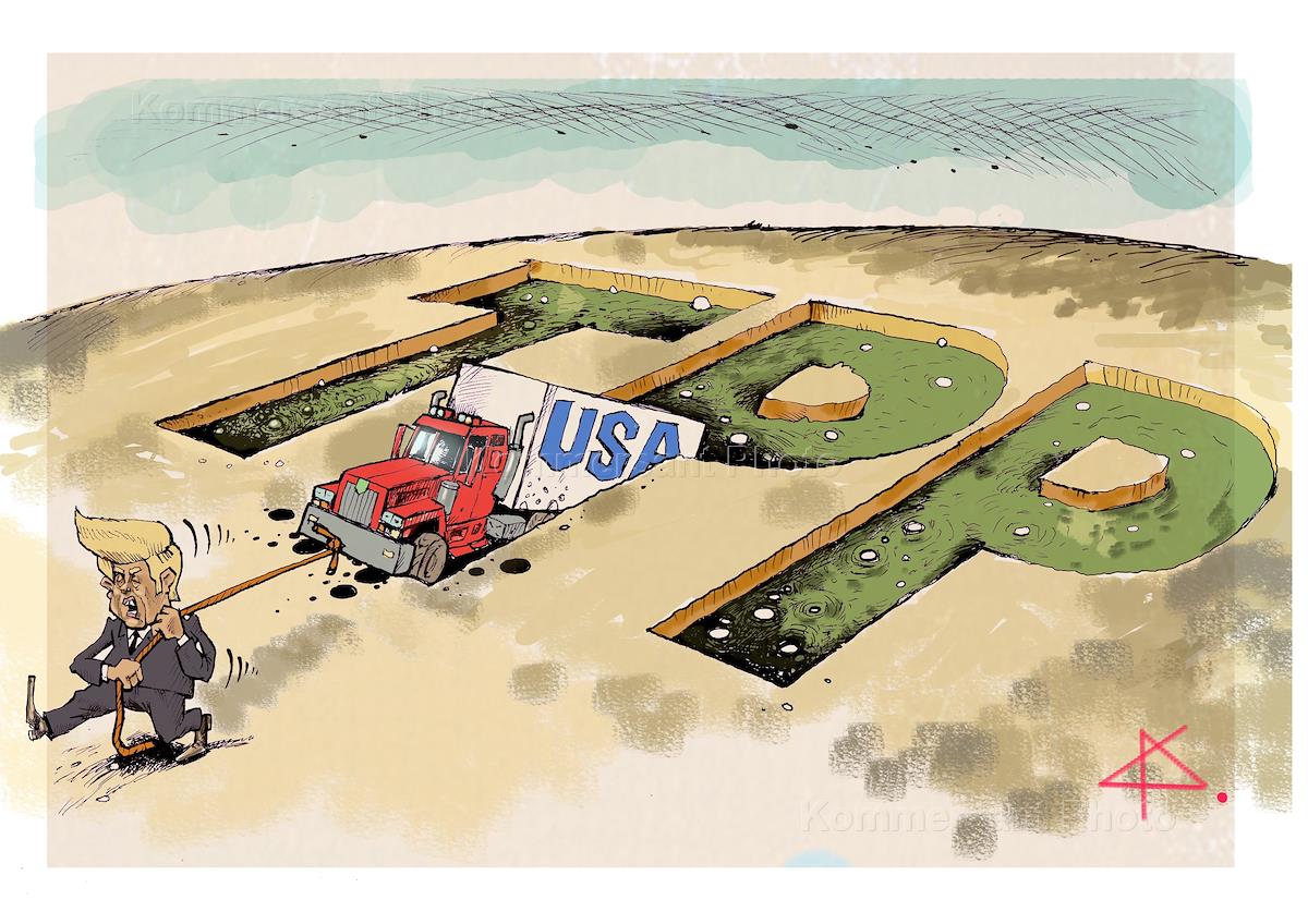 In this caricature illustration U.S. President Donald Trump, throwing away newspapers and magazines, is portrayed.
