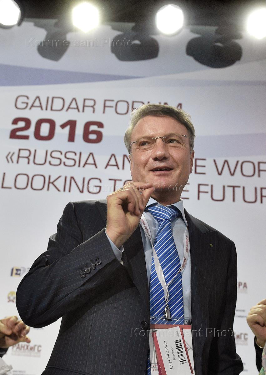 Гайдаровский форум 2016 "Россия и мир: взгляд в будущее" прошел в Российской академии народного хозяйства и государственной службы при президенте России. Президент "Сбербанка России" Герман Греф во время панельной дискуссии "Будущее невозможного".