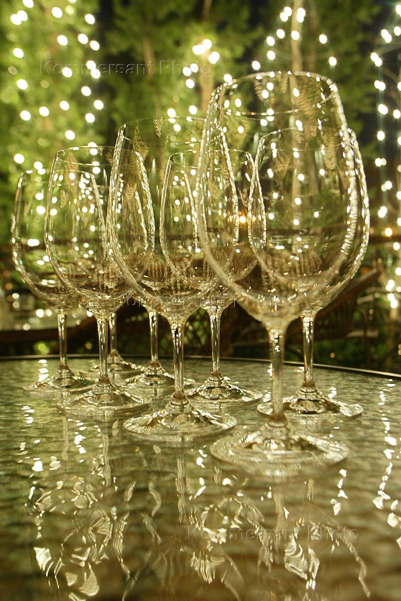 Spire of the Ukraina Hotel is reflected in the empty glass on a table of the Grin Restaurant outdoor premises.