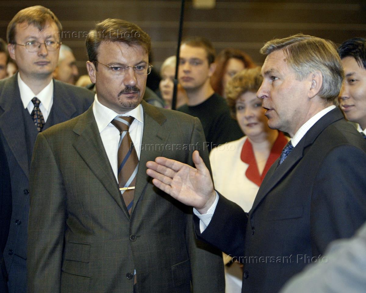 Russian Trade and Economic Development Minister German Gref (left) and Education Minister Vladimir Filippov (right) arrive at a meeting of teh Trade and Economic Development Ministry College.