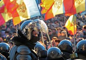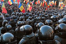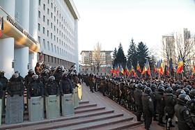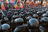 Заседание парламента Республики Молдова. Столкновения между полицией и протестующими против правительства. Полицейские в касках во время блокировки демонстрантов.