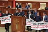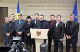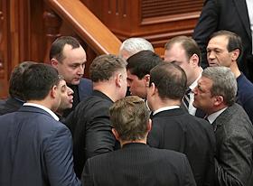 Представители оппозиции: "Партии социалистов" (ПСРМ), "Нашей партии" и Гражданской платформы DA ("Достоинство и правда") в Парламенте Молдовы на заседании с требованием досрочных выборов членов Парламента.