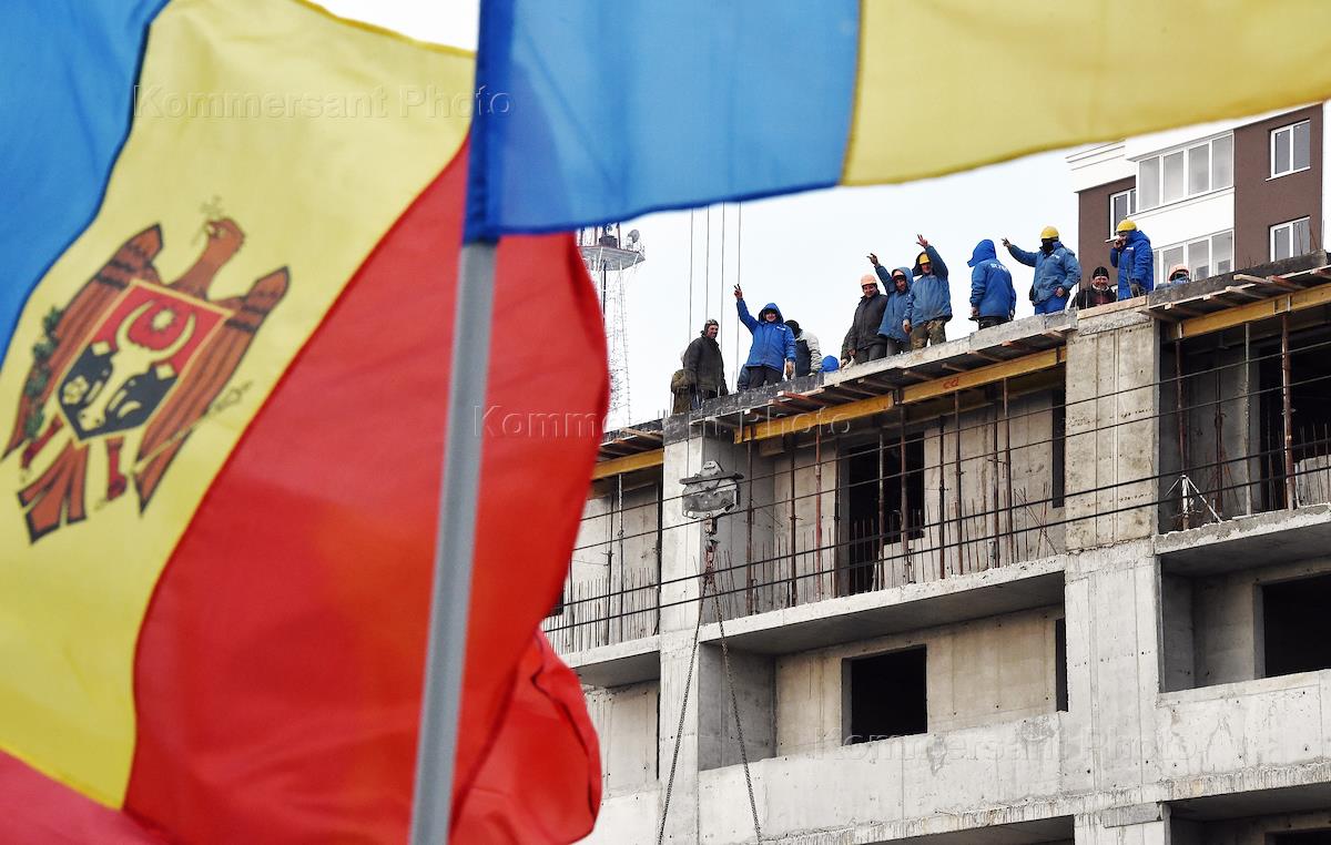 Политическая ситуация в Кишиневе. Демонстранты с флагом во время митинга.