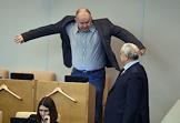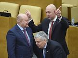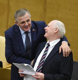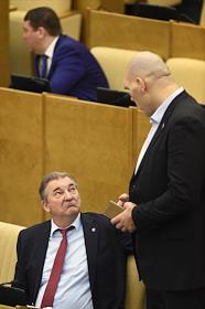 Заместитель председателя комитета Государственной думы (ГД) России по труду, социальной политике и делам ветеранов Николай Коломейцев (слева) и член комитета ГД по образованию Григорий Балыхин (справа) во время заседания Госдумы.