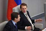 Первый заместитель председателья Государственной думы (ГД) России Александр Жуков (слева) и председатель ГД Сергей Нарышкин (справа) во время заседания Госдумы.