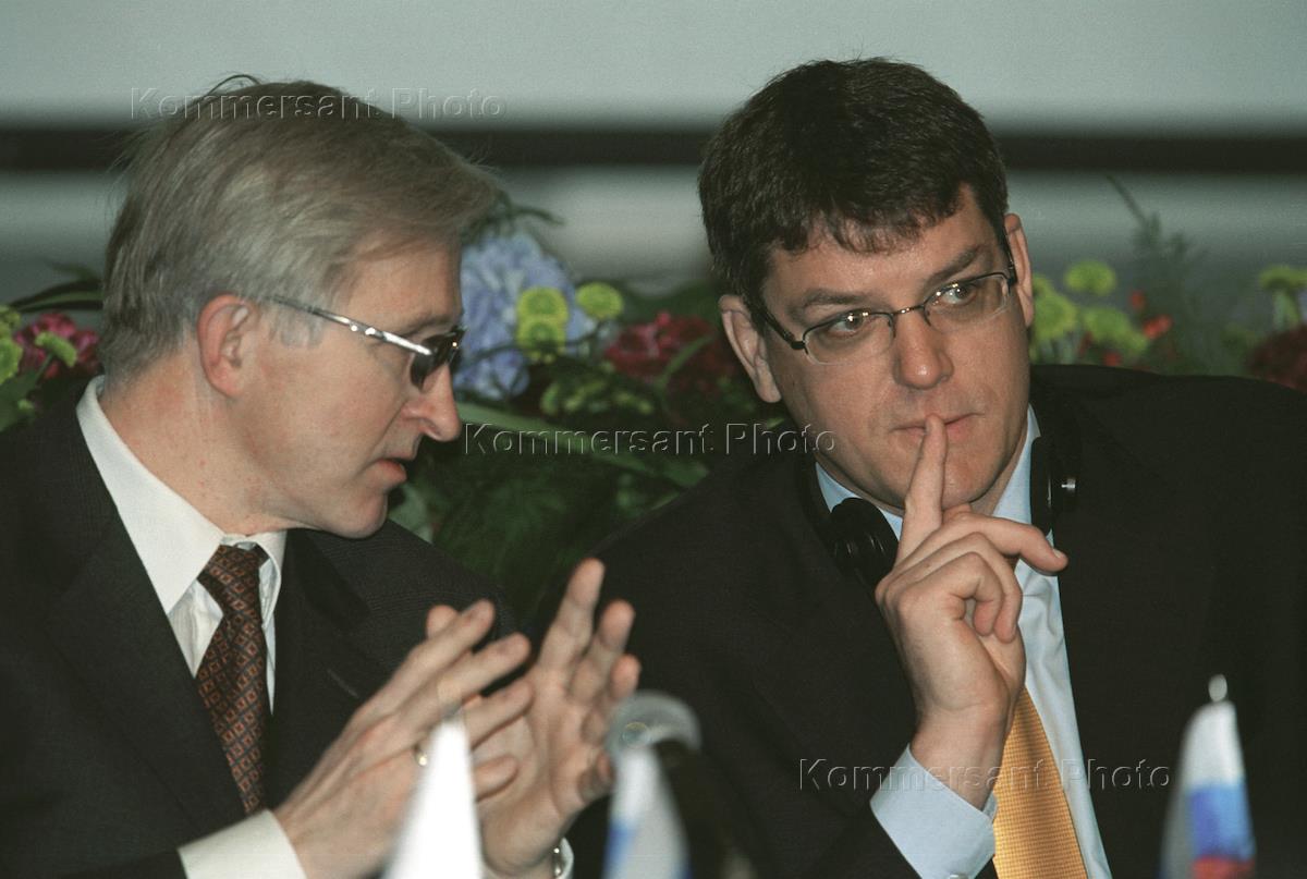Председатель наблюдательного совета инвестиционной группы "Ренессанс Капитал" Александр Шохин (слева) и председатель правления НК ЮКОС Михаил Ходорковский (справа) на открытии ежегодной конференция инвесторов группы "Ренессанс Капитал" в Торгово-промышленной палате России.