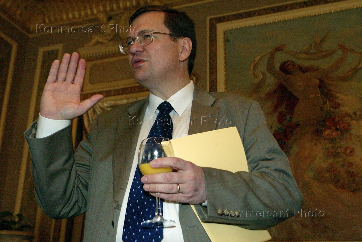 Member of Gazprom directors board Boris Fedorov takes part in the news conference summoned by the 'Liberal Russia' party to present its strategy for the forthcoming parliamentary election. The news conference was held in the Savoy Hotel.