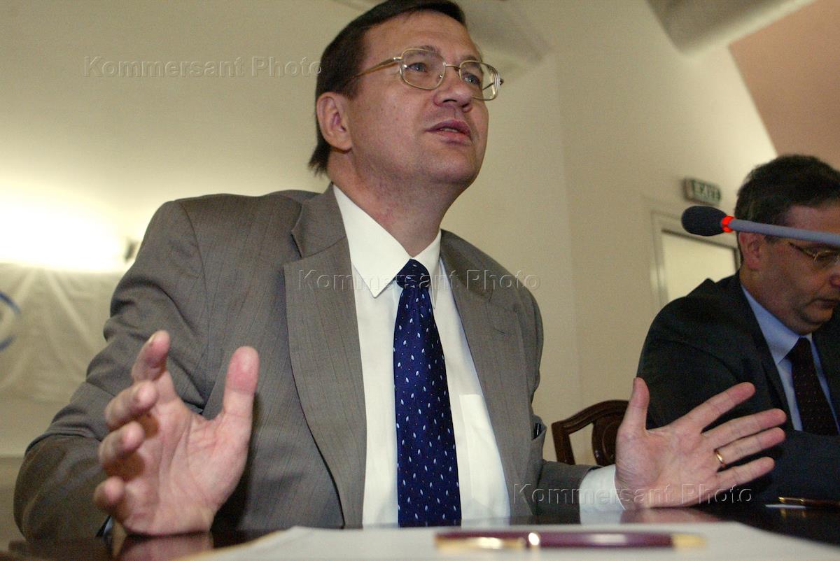 Member of the State Duma 'Union of the Right Forces' faction, leader of the 'Liberal Russia' party Victor Pokhmelkin (left) and member of the Gazprom directors board Boris Fedorov take part in the news conference summoned to announce the 'Liberal Russia' strategy for the forthcoming parliamentary election.