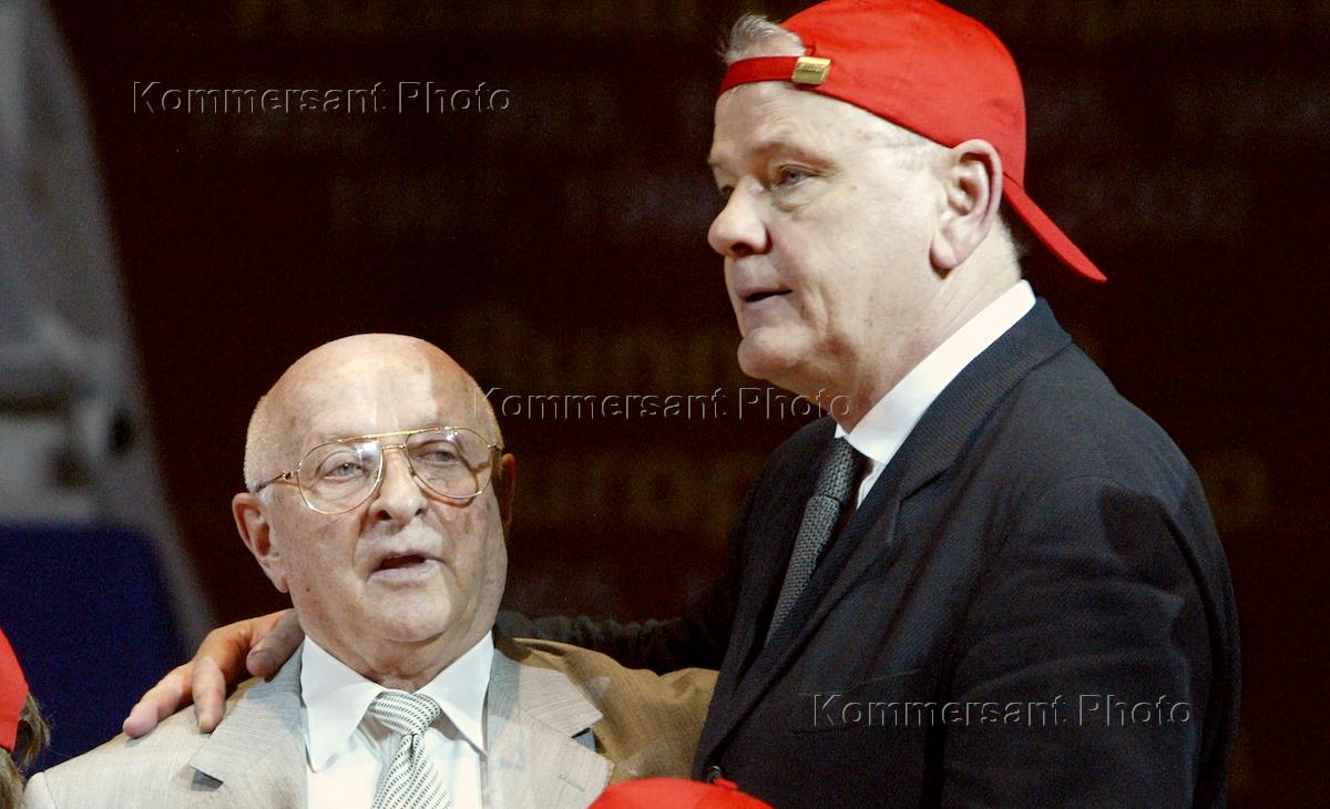 Президент баскетбольного клуба ЦСКА Александр Гомельский (слева) и главный тренер баскетбольной команды ЦСКА Душан Ивкович (справа) наблюдают за игрой баскетболистов своей команды во время матча "ЦСКА" и "Урал-Грейт". Матч состоялся в спорткомплексе ЦСКА.