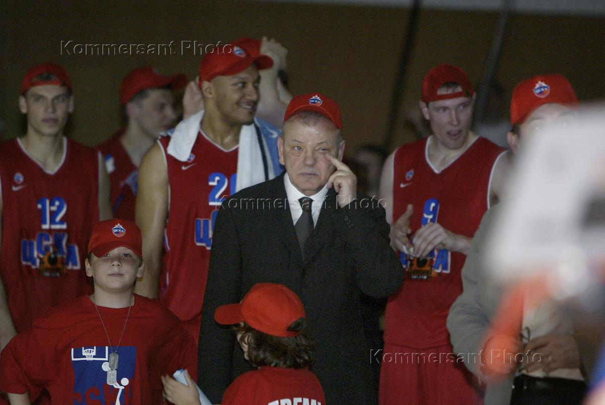 Президент баскетбольного клуба ЦСКА Александр Гомельский (второй слева) и главный тренер баскетбольной команды ЦСКА Душан Ивкович (второй справа) празднуют победу баскетболистов своей команды в матче ЦСКА и "Урал-Грейт". Матч состоялся в спорткомплексе ЦСКА.