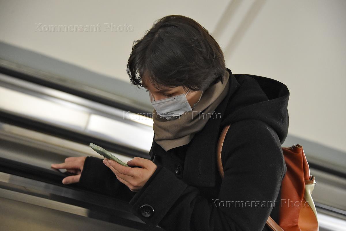 Жанровая фотография. Эпидемия гриппа. Люди в медицинских масках в московском метро.
