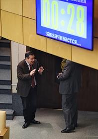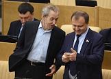 Член комитета Государственной думы (ГД) России по труду, социальной политике и делам ветеранов Валерий Трапезников (слева) и член комитета ГД по природным ресурсам, природопользованию и экологии Александр Фокин (справа) во время заседания Госдумы.
