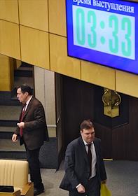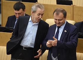 Член комитета Государственной думы (ГД) России по промышленности Валерий Омельченко (слева) и заместитель председателя комитета ГД России по природным ресурсам, природопользованию и экологии Михаил Слипенчук (справа) во время заседания Госдумы.