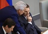 Председатель комитета Государственной думы (ГД) России по бюджету и налогам Андрей Макаров (слева) и председатель комитета ГД по информационной политике, информационным технологиям и связи Леонид Левин (справа) во время заседания Госдумы.