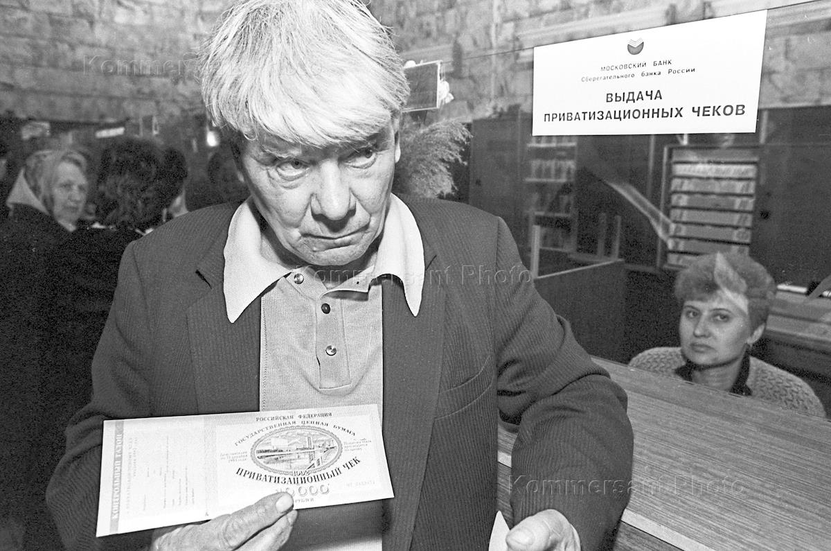 Выдача приватизационных чеков (ваучеров) в отделении Сбербанка России. Пожилой мужчина держит ваучер.