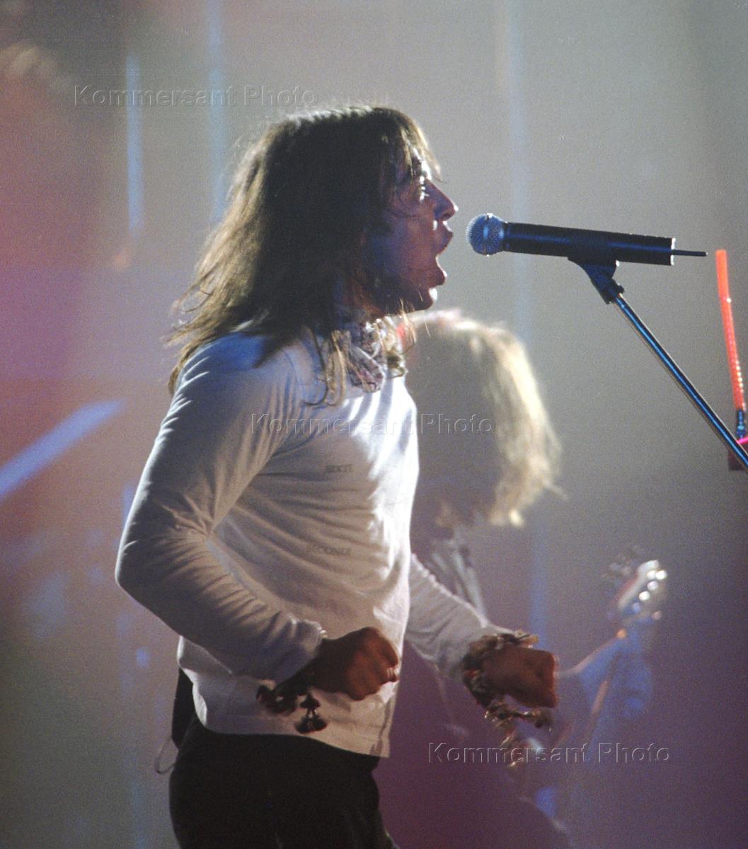 Лидер группы "Мумий Тролль" Илья Лагутенко во время выступления на рок-марафоне "MAXIDROM" в спорткомплексе "Олимпийский".