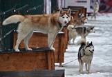 Реабилитационная программа для детей и подростков с ограниченными возможностями здоровья "По пути с Хаски" в Парке культуры и отдыха (ПКиО) "Сокольники". Собаки в загонах.