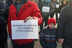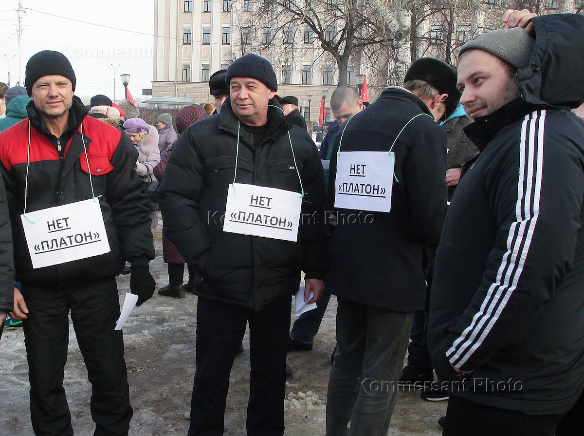 Участники митинга, организованного КПРФ с табличками: "Поборы за дороги - это поборы с населения" и "Нет Платон".