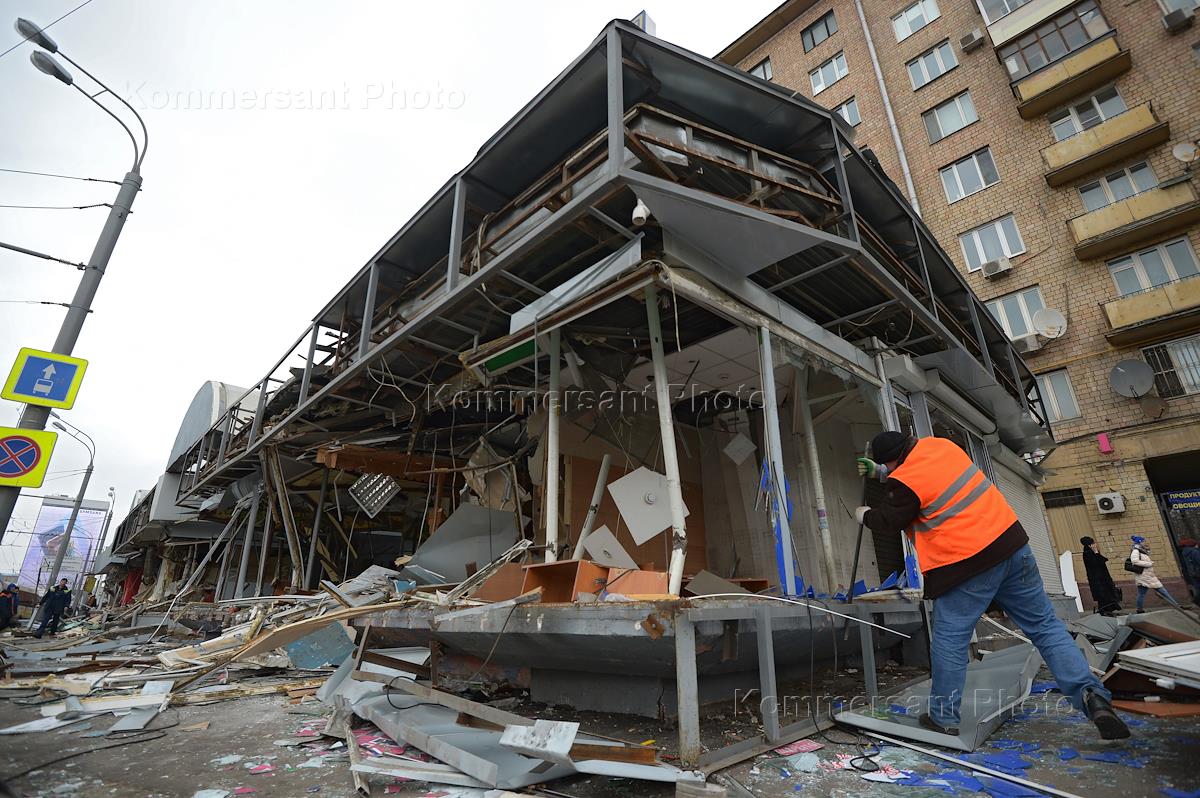 Жанровая фотография. Сотрудники коммунальных служб города во время сноса незаконно построенных торговых павильонов у станций метро "Аэропорт".