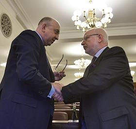 Председатель комитета Государственной думы России по конституционному законодательству и государственному строительству Владимир Плигин (слева) и председатель Совета при президенте России по развитию гражданского общества и правам человека Михаил Федотов (справа) во время специального заседания, посвященное обсуждению законопроекта о внесении изменений в ФЗ "О некоммерческих организациях" в части уточнения понятия политической деятельности, прошло в Администрации президента России.