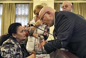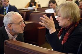 Телеведущий Николай Сванидзе (слева) и Председатель правления региональной общественной организации "Независимый экспертно-правовой совет" Мара Полякова (справа) во время специального заседания, посвященное обсуждению законопроекта о внесении изменений в ФЗ "О некоммерческих организациях" в части уточнения понятия политической деятельности, прошло в Администрации президента России.