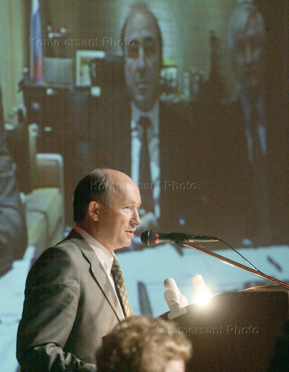 Внеочередной съезд партии "Либеральная Россия". Предприниматель Борис Березовский (в центре на мониторе) из Лондона с помощью телемоста участвует в работе съезда. Представители 51-ого регионального отделения партии избрали новые руководящие органы и обратились к первому Президенту России Борису Ельцину с просьбой разрешить использовать его имя и образ в качестве символа "Либеральной России". Съезд прошел в гостинице "Космос".