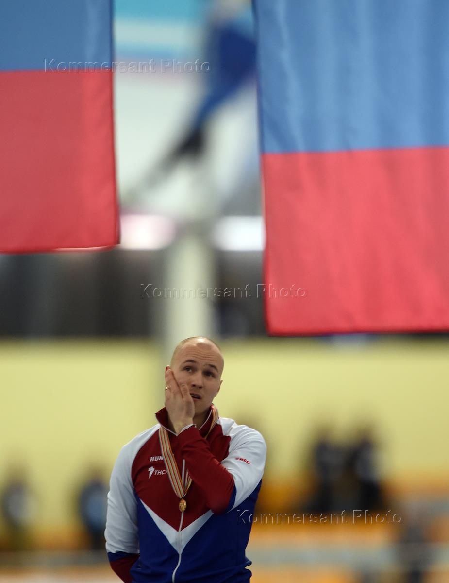 Чемпионат мира по конькобежному спорту 2016 в Коломне. Российский спортсмен Павел Кулижников, занявший первое место в забеге среди мужчин на 1000 метров в соревнованиях по конькобежному спорту.